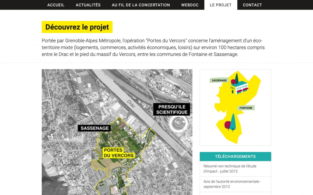 Le projet d’aménagement urbain Portes du Vercors, porté par Grenoble Alpes Métrople, est situé sur les commune de Fontaine et Sassenage. Le site développé sous WordPress à l’aide d’un thème spécifique permet de rendre compte de la concertation avec les habitants initiée avec BazarUrbain, Adrets et territoires, et Dyade.