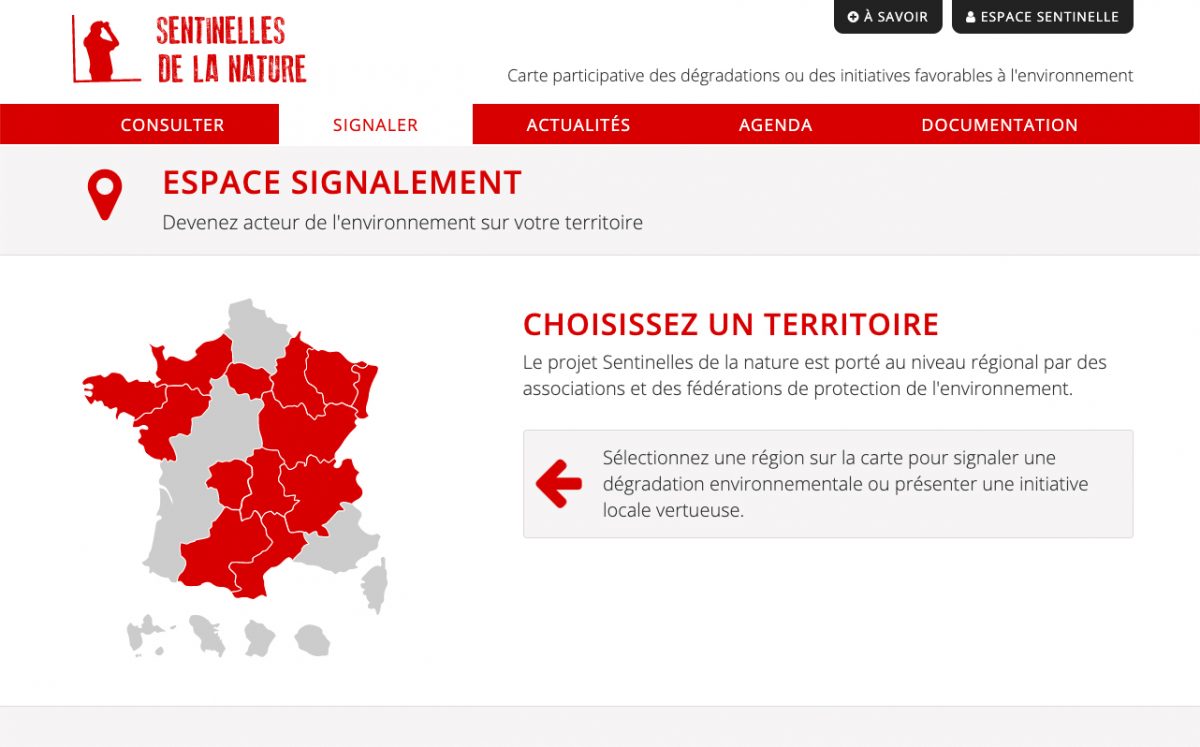 Le signalement s’effectue en créant un compte « Sentinelle » sur le site. L’utilisateur choisi la région concernée par son signalement (atteinte environnementale ou initiative positive), le localise sur une carte, et utilise les contrôles de formulaires disponibles pour décrire et classifier son signalement.